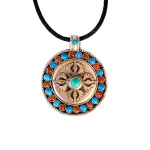 This handcrafted pendant from Nepal features the Double Vajra (Vishvavajra), a traditional symbol representing stability, protection, and the unshakable foundation of truth. The double vajra represents spiritual balance and the union of opposites.