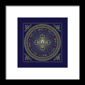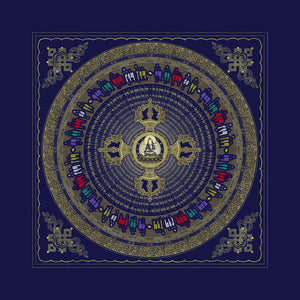 Detailed medicine mandala with intricate patterns and vibrant colors is centered on a deep blue background bordered by ornate, golden designs. The mandala features the mantra om ah hum mum lam mam pam tham in the colors of the 5 elements, radiating inwards towards the center. Yuthok is shown in the center of the mandala in a double dorje.