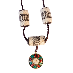 Yak wool woven beaded necklace with gemstone talisman handmade by Laklema by nomad women in Amdo, Tibet.