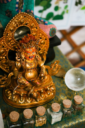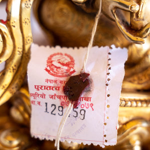 Handcrafted in Kathmandu, Nepal by master artisans, the statue is ten inches tall, copper with gold plating, filled with special substances and fully consecrated by Buddhist monks in the Kathmandu valley.
